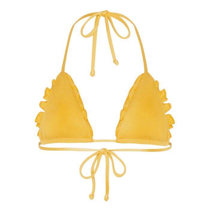 •dark yellow color •Shiny, soft, durable, •seamless stitching, •adjustable halter ties, •adjustable tie closure, •ruffle bust detail. •80% Nylon, 20% Spandex